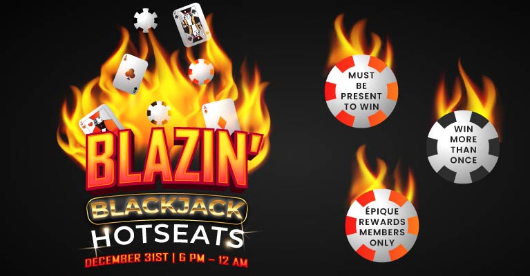 Rules: Épique Rewards members must have their card activated by the dealer prior to winning the hot seat. Players must ensure that they are a named player. Players must be actively playing Blackjack to qualify. Guests must possess a valid photo ID and Épique Rewards card. Failure to do so will result in a new winner being selected. Prizes will be distributed at the table. Prizes will be valid until 11:59 pm the following day. Guests may win more than once. Management reserves all rights to alter or stop the promotion at any time without warning.