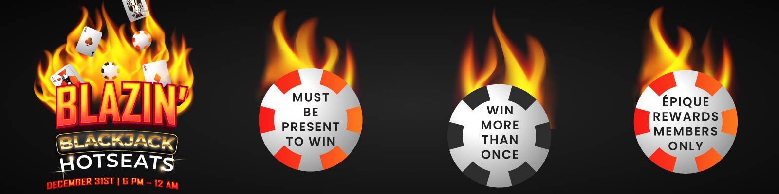 Rules: Épique Rewards members must have their card activated by the dealer prior to winning the hot seat. Players must ensure that they are a named player. Players must be actively playing Blackjack to qualify. Guests must possess a valid photo ID and Épique Rewards card. Failure to do so will result in a new winner being selected. Prizes will be distributed at the table. Prizes will be valid until 11:59 pm the following day. Guests may win more than once. Management reserves all rights to alter or stop the promotion at any time without warning.